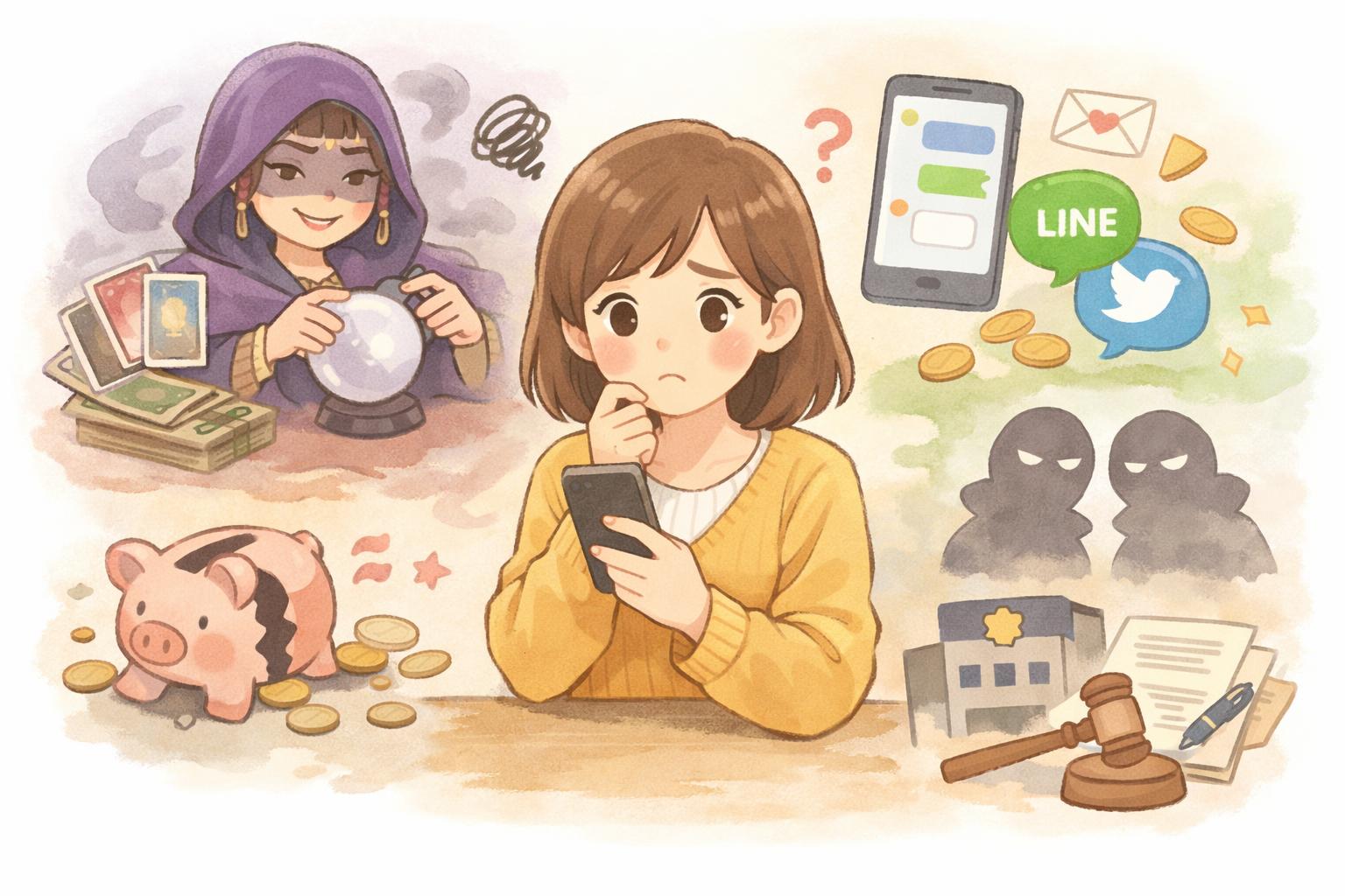「この占い、高額だけど本当に当たるの?」「もしかして騙されているかも…」と不安に思っていませんか。近年、LINEやSNSの普及に伴い、占い詐欺の被害が急増しています。この記事では、巧妙化する最新の占い詐欺の手口と、危険な占い師やサイトをすぐに見抜けるチェックリストを、法律のプロが徹底解説します。結論から言うと、占い詐欺は正しい知識で予防でき、万が一被害に遭っても返金を諦める必要はありません。本記事を読めば、具体的な対処法から、警察や弁護士など状況に応じた相談先の選び方、返金請求の法的根拠まで、あなたの不安を解決する方法がすべて分かります。